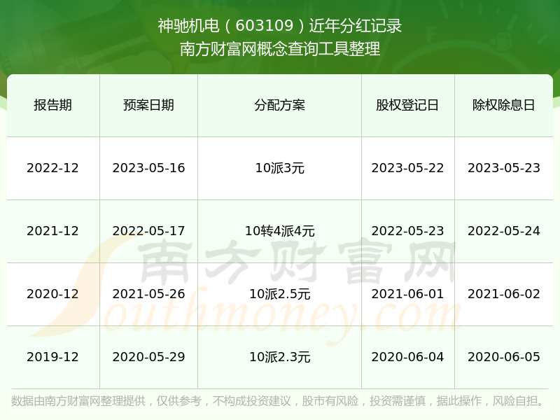 神馳機(jī)電最新一次公布的分紅方案為10派3元。本次權(quán)益分派股權(quán)登記日為2023年5月22日,除權(quán)除息日為2023年5月23日,派息日為2023年5月23日。