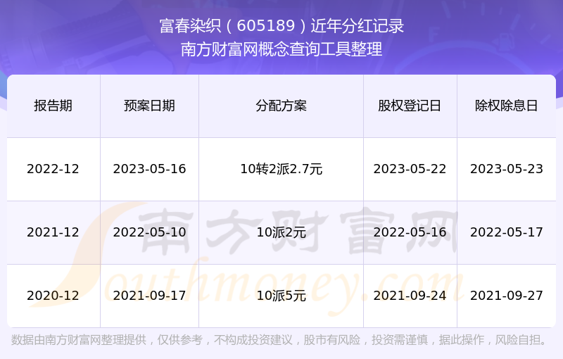 富春染織最新一次公布的分紅方案為10轉(zhuǎn)2派2.7元。本次權益分派股權登記日為2023年5月22日,除權除息日為2023年5月23日,派息日為2023年5月23日。