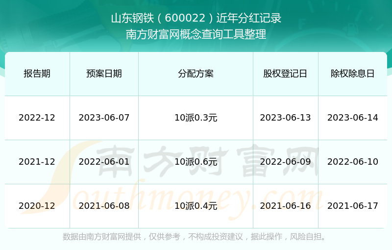 山東鋼鐵最新一次公布的分紅方案為10派0.3元。本次權(quán)益分派股權(quán)登記日為2023年6月13日,除權(quán)除息日為2023年6月14日,派息日為2023年6月14日。