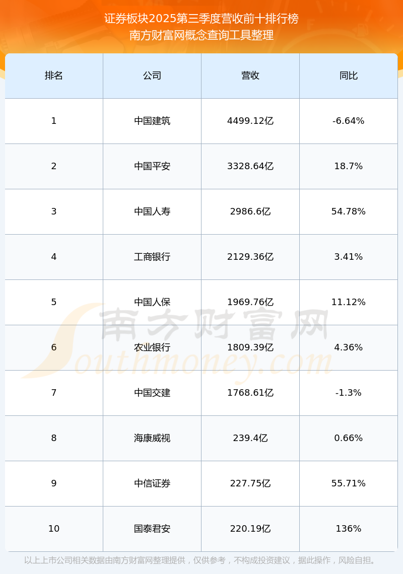 按照南方財(cái)富網(wǎng)概念查詢工具統(tǒng)計(jì),該股所屬板塊為證券板塊,該板塊共有65只股票,華泰證券2025第三季度營(yíng)收在該板塊中排名為第11名,該板塊2025第三季度營(yíng)收排名前十的股票如下表: