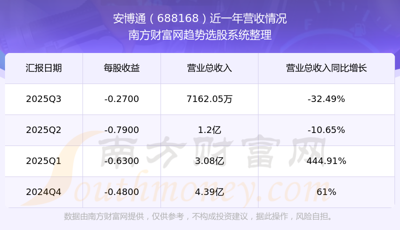 安博通2025年第三季度財報顯示,公司主營收入7162.05萬元,同比-32.49%;歸母凈利潤-2132.58萬元,同比-5.44%;扣非凈利潤-2158.89萬元,同比-0.45%。