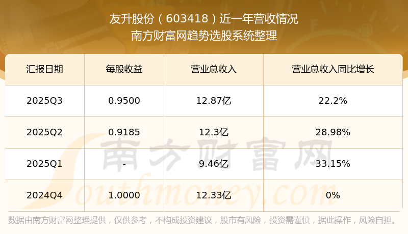 友升股份(603418)披露2025年第三季度報告,報告期實現(xiàn)營收12.87億元,同比22.2%;歸母凈利潤1.38億元,同比22.34%;扣非凈利潤1.37億元,同比19.32%。