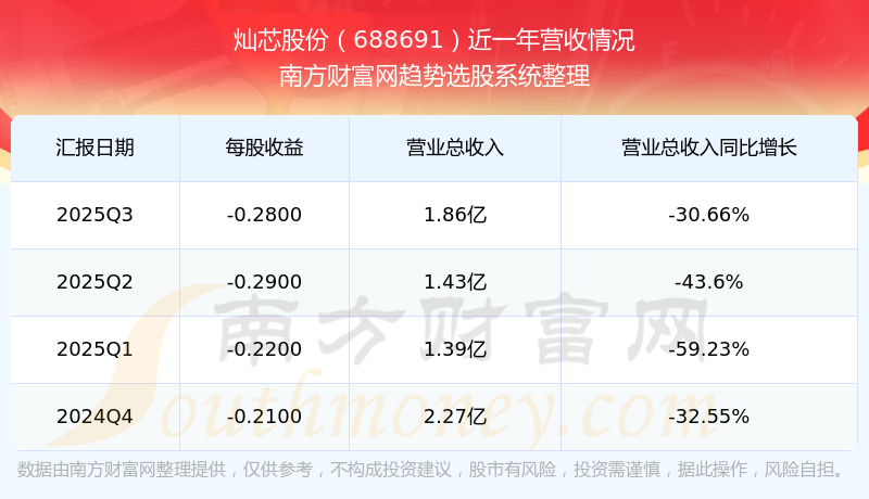 燦芯股份2025年第三季度顯示,公司主營收入1.86億元,同比-30.66%;歸母凈利潤-3361.18萬元,同比-2289.84%;扣非凈利潤-3629.06萬元,同比-2736.25%。