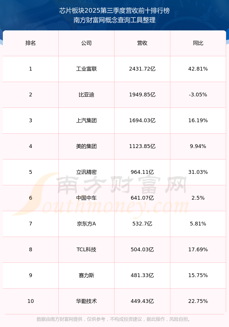 按照南方財富網(wǎng)概念查詢工具統(tǒng)計,該股所屬板塊為芯片板塊,該板塊共有900只股票,燦芯股份2025第三季度營收在該板塊中排名為第694名,該板塊2025第三季度營收排名前十的股票如下表: