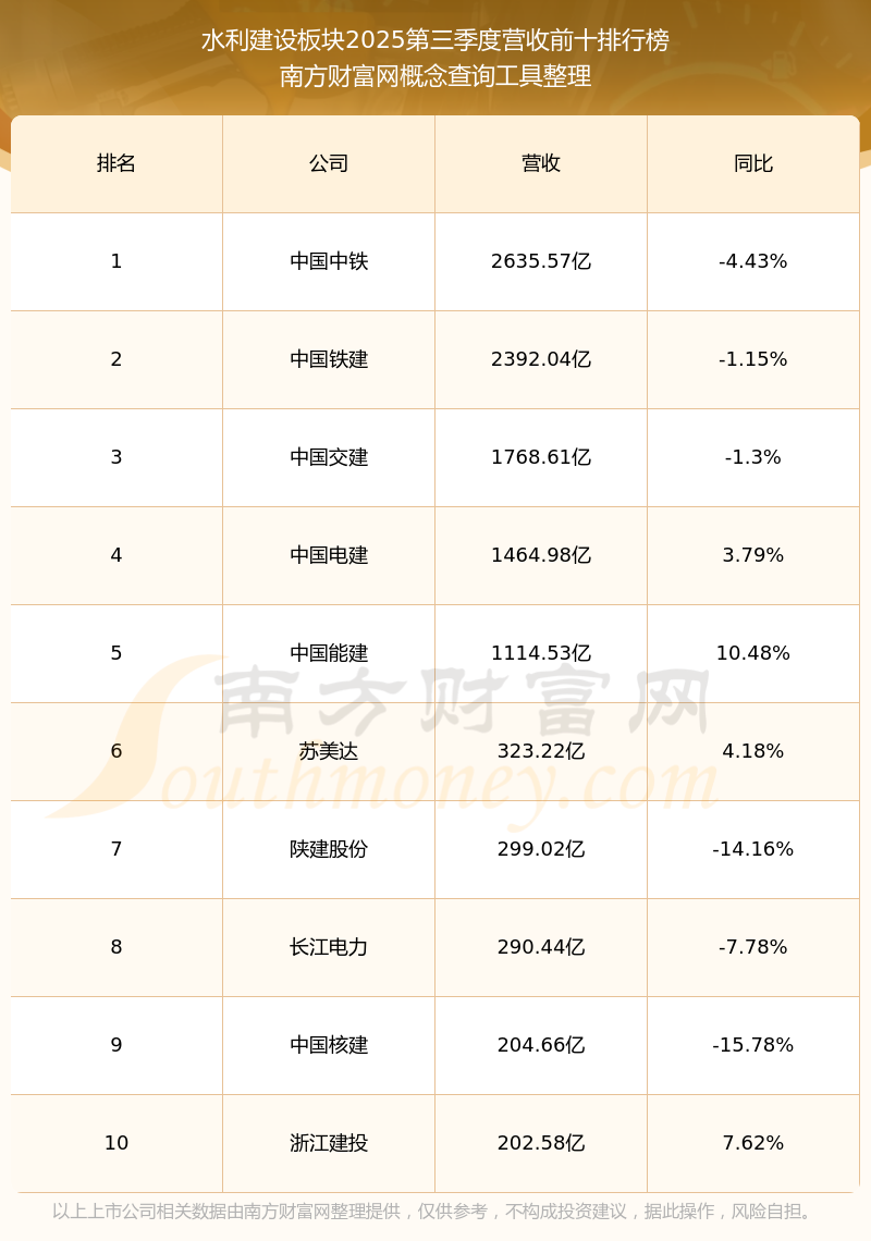 按照南方財富網(wǎng)概念查詢工具統(tǒng)計,該股所屬板塊為水利建設(shè)板塊,該板塊共有137只股票,銀龍股份2025第三季度營收在該板塊中排名為第56名,該板塊2025第三季度營收排名前十的股票如下表: