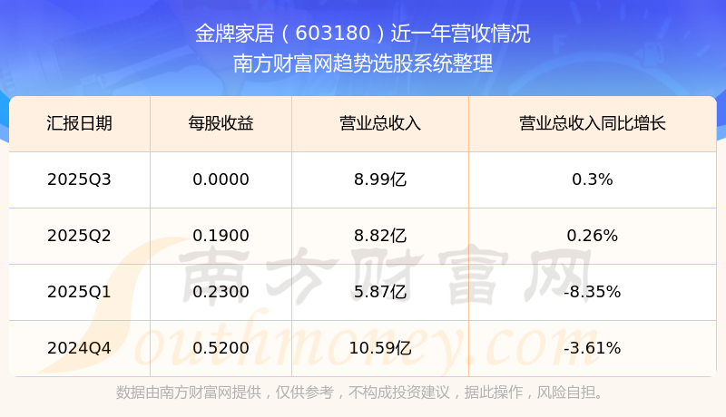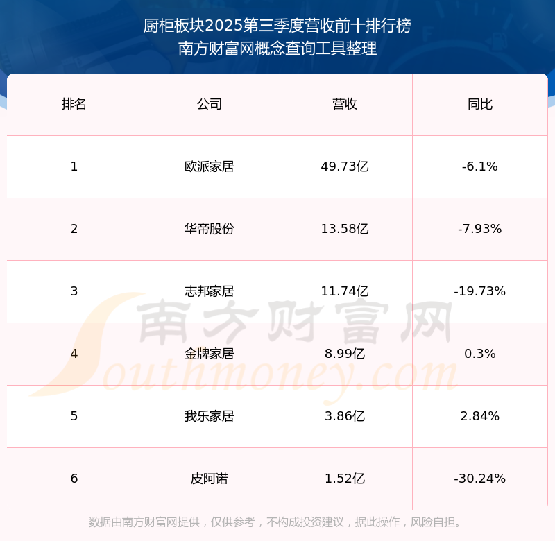 按照南方財(cái)富網(wǎng)概念查詢工具統(tǒng)計(jì),該股所屬板塊為廚柜板塊,該板塊共有6只股票,金牌家居2025第三季度營(yíng)收在該板塊中排名為第4名,該板塊2025第三季度營(yíng)收排名前十的股票如下表: