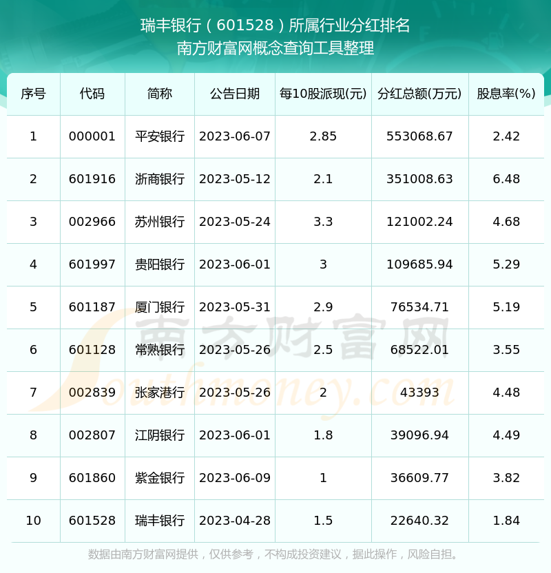 按照南方財富網(wǎng)趨勢選股系統(tǒng)統(tǒng)計,瑞豐銀行所屬行業(yè)為銀行行業(yè),銀行行業(yè)分紅排名情況如下表: