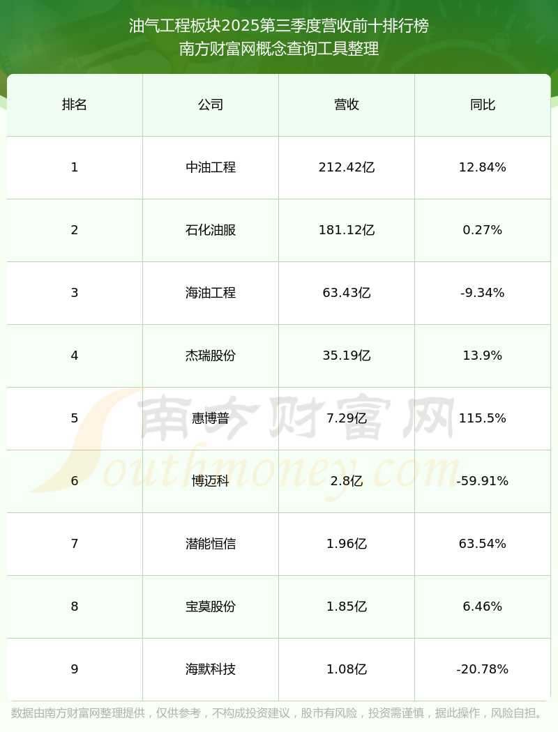 按照南方財(cái)富網(wǎng)概念查詢工具統(tǒng)計(jì),該股所屬板塊為油氣工程板塊,該板塊共有9只股票,中油工程2025第三季度營收在該板塊中排名為第1名,該板塊2025第三季度營收排名前十的股票如下表: