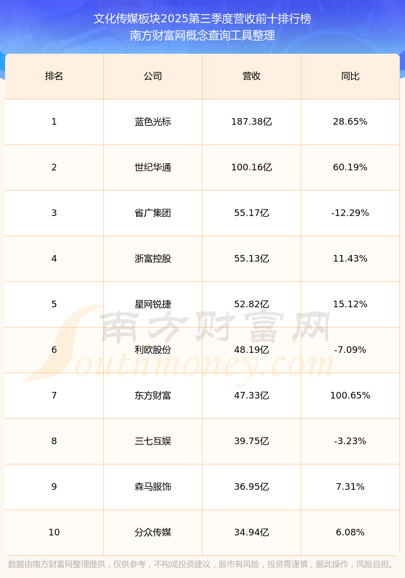 按照南方財(cái)富網(wǎng)概念查詢工具統(tǒng)計(jì),該股所屬板塊為文化傳媒板塊,該板塊共有240只股票,東望時(shí)代2025第三季度營(yíng)收在該板塊中排名為第197名,該板塊2025第三季度營(yíng)收排名前十的股票如下表: