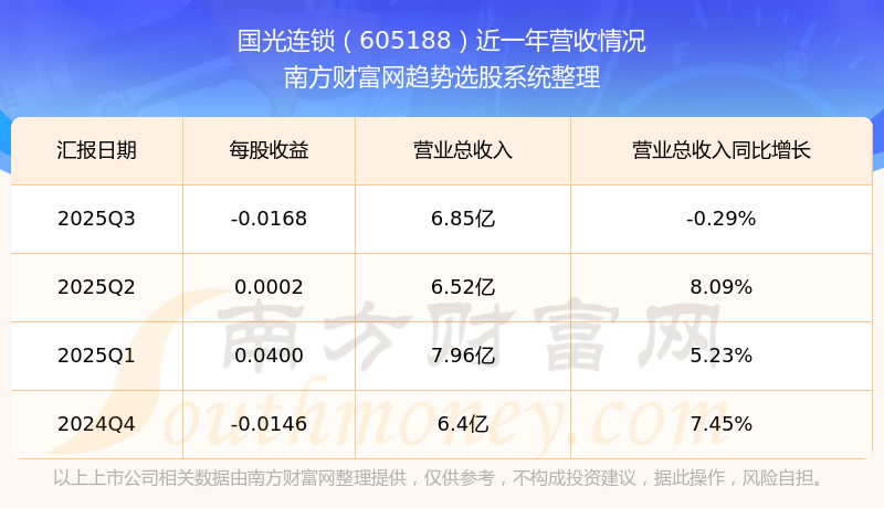 財報顯示,2025年第三季度國光連鎖營收6.85億元,同比增長-0.29%,凈利潤-841.23萬元,同比增長22.98%。