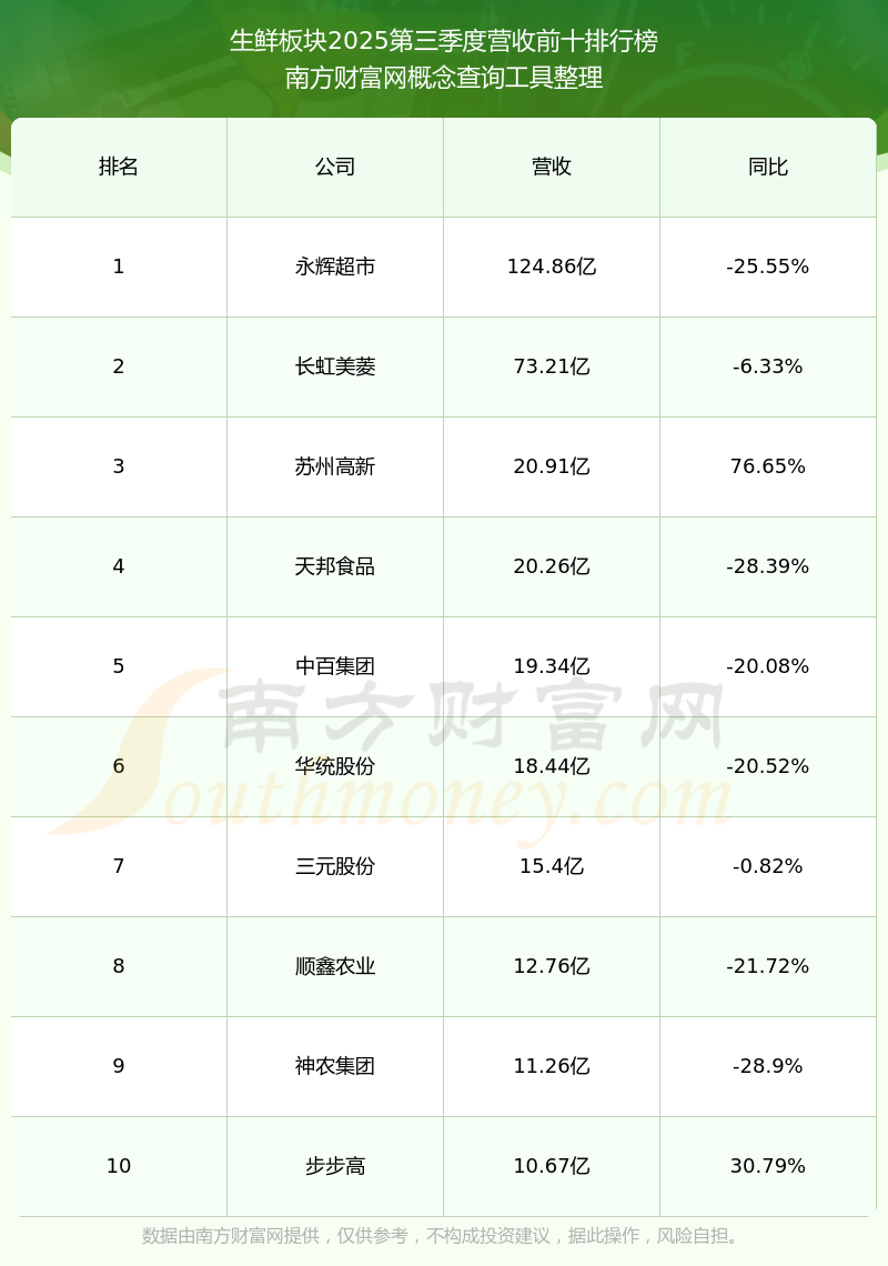 按照南方財富網(wǎng)概念查詢工具統(tǒng)計,該股所屬板塊為生鮮板塊,該板塊共有19只股票,國光連鎖2025第三季度營收在該板塊中排名為第19名,該板塊2025第三季度營收排名前十的股票如下表:
