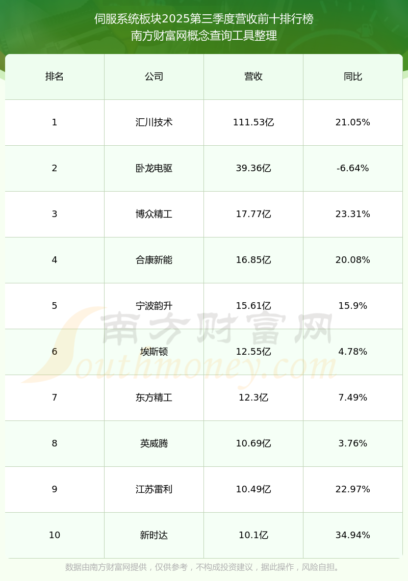 按照南方財富網(wǎng)概念查詢工具統(tǒng)計,該股所屬板塊為伺服系統(tǒng)板塊,該板塊共有30只股票,偉創(chuàng)電氣2025第三季度營收在該板塊中排名為第18名,該板塊2025第三季度營收排名前十的股票如下表: