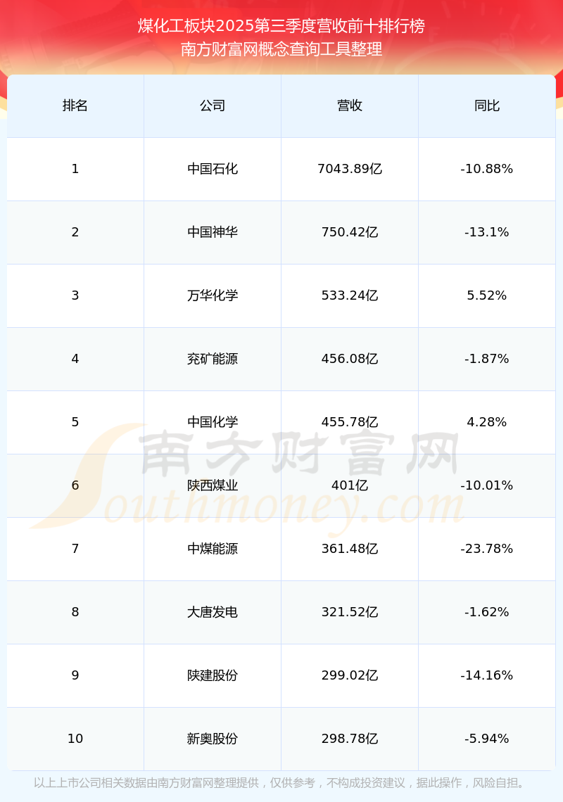 按照南方財(cái)富網(wǎng)概念查詢工具統(tǒng)計(jì),該股所屬板塊為煤化工板塊,該板塊共有121只股票,兗礦能源2025第三季度營(yíng)收在該板塊中排名為第4名,該板塊2025第三季度營(yíng)收排名前十的股票如下表: