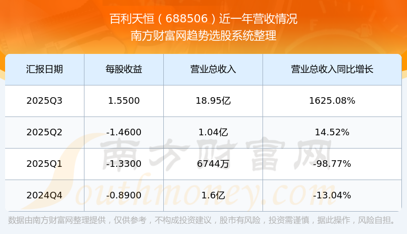 百利天恒(688506)披露2025年第三季度報(bào)告,報(bào)告期實(shí)現(xiàn)營(yíng)收18.95億元,同比1625.08%;歸母凈利潤(rùn)6.23億元,同比203.74%;扣非凈利潤(rùn)6.01億元,同比199.84%;基本每股收益1.55元。