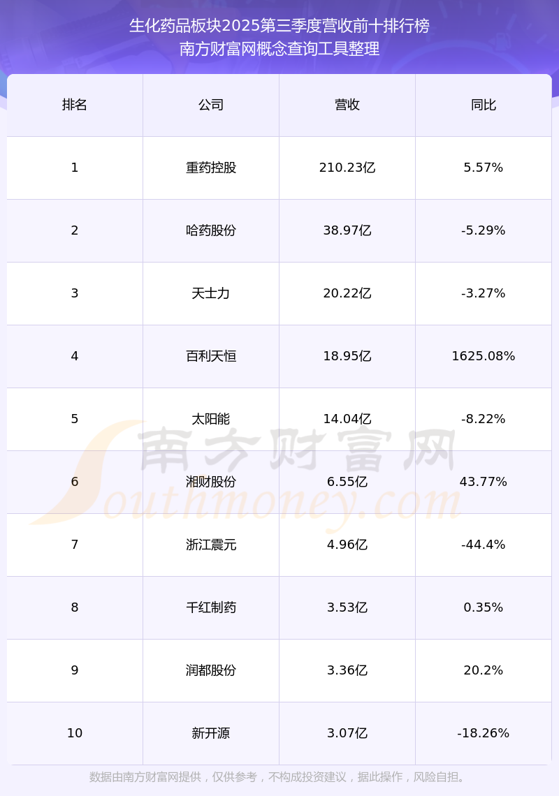 按照南方財(cái)富網(wǎng)概念查詢工具統(tǒng)計(jì),該股所屬板塊為生化藥品板塊,該板塊共有12只股票,百利天恒2025第三季度營(yíng)收在該板塊中排名為第4名,該板塊2025第三季度營(yíng)收排名前十的股票如下表: