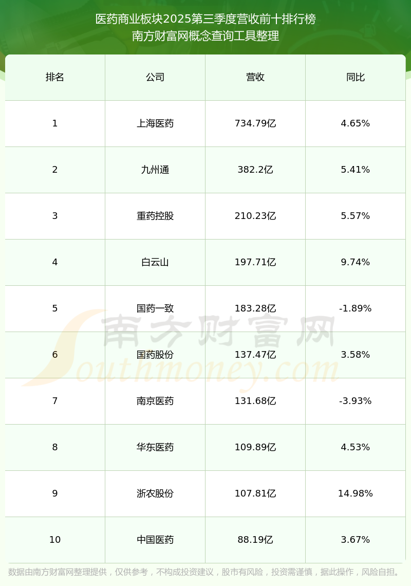 按照南方財(cái)富網(wǎng)概念查詢工具統(tǒng)計(jì),該股所屬板塊為醫(yī)藥商業(yè)板塊,該板塊共有62只股票,中國(guó)醫(yī)藥2025第三季度營(yíng)收在該板塊中排名為第10名,該板塊2025第三季度營(yíng)收排名前十的股票如下表: