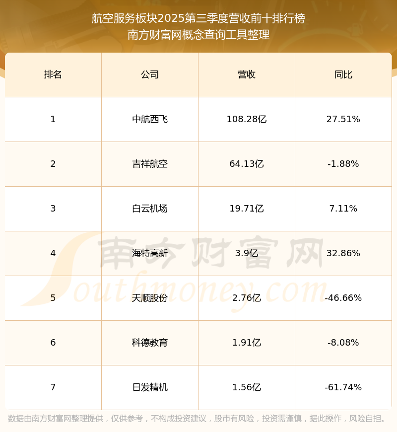 按照南方財(cái)富網(wǎng)概念查詢工具統(tǒng)計(jì),該股所屬板塊為航空服務(wù)板塊,該板塊共有7只股票,白云機(jī)場2025第三季度營收在該板塊中排名為第3名,該板塊2025第三季度營收排名前十的股票如下表: