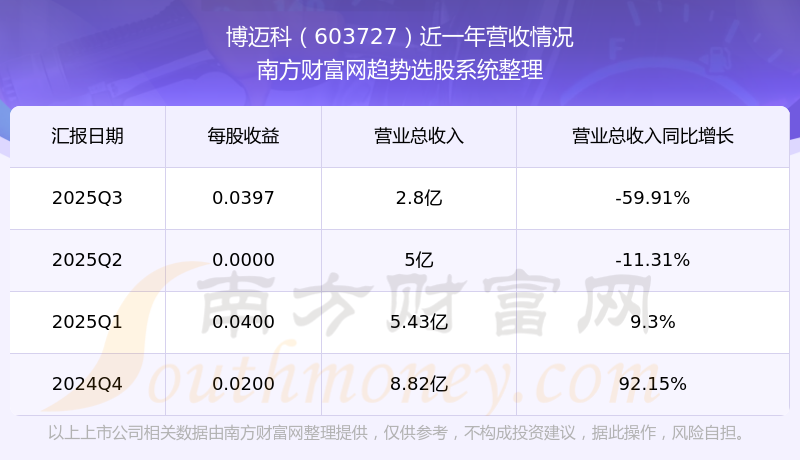 在2025年第三季度,博邁科的業(yè)績表現,主營業(yè)務收入達到2.8億元,實現了-59.91%的同比增長率。同時,公司歸母凈利潤錄得1102.38萬元,同比增長-64.75%。