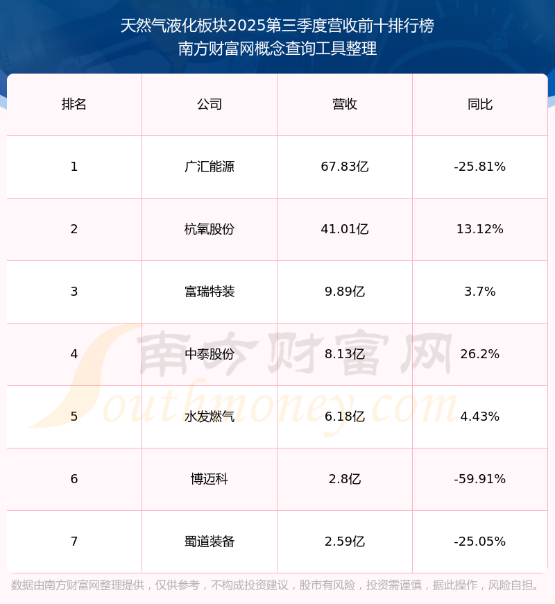 按照南方財富網概念查詢工具統計,該股所屬板塊為天然氣液化板塊,該板塊共有7只股票,博邁科2025第三季度營收在該板塊中排名為第6名,該板塊2025第三季度營收排名前十的股票如下表: