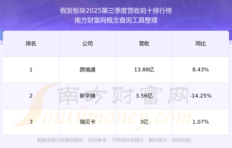 按照南方財富網(wǎng)概念查詢工具統(tǒng)計,該股所屬板塊為假發(fā)板塊,該板塊共有3只股票,瑞貝卡2025第三季度營收在該板塊中排名為第3名,該板塊2025第三季度營收排名前十的股票如下表: