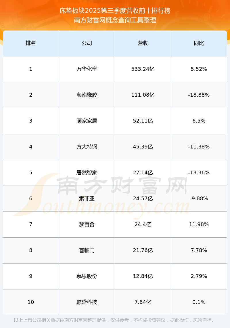 按照南方財富網(wǎng)概念查詢工具統(tǒng)計,該股所屬板塊為床墊板塊,該板塊共有14只股票,麒盛科技2025第三季度營收在該板塊中排名為第10名,該板塊2025第三季度營收排名前十的股票如下表: