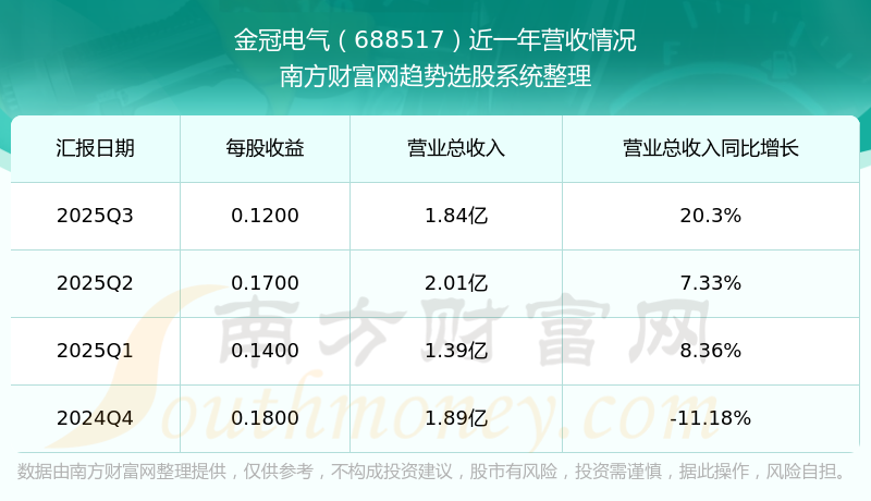 金冠電氣2025年第三季度財報顯示,公司主營收入1.84億元,同比20.3%;歸母凈利潤1682.27萬元,同比11.23%;扣非凈利潤1447.72萬元,同比-2.76%;