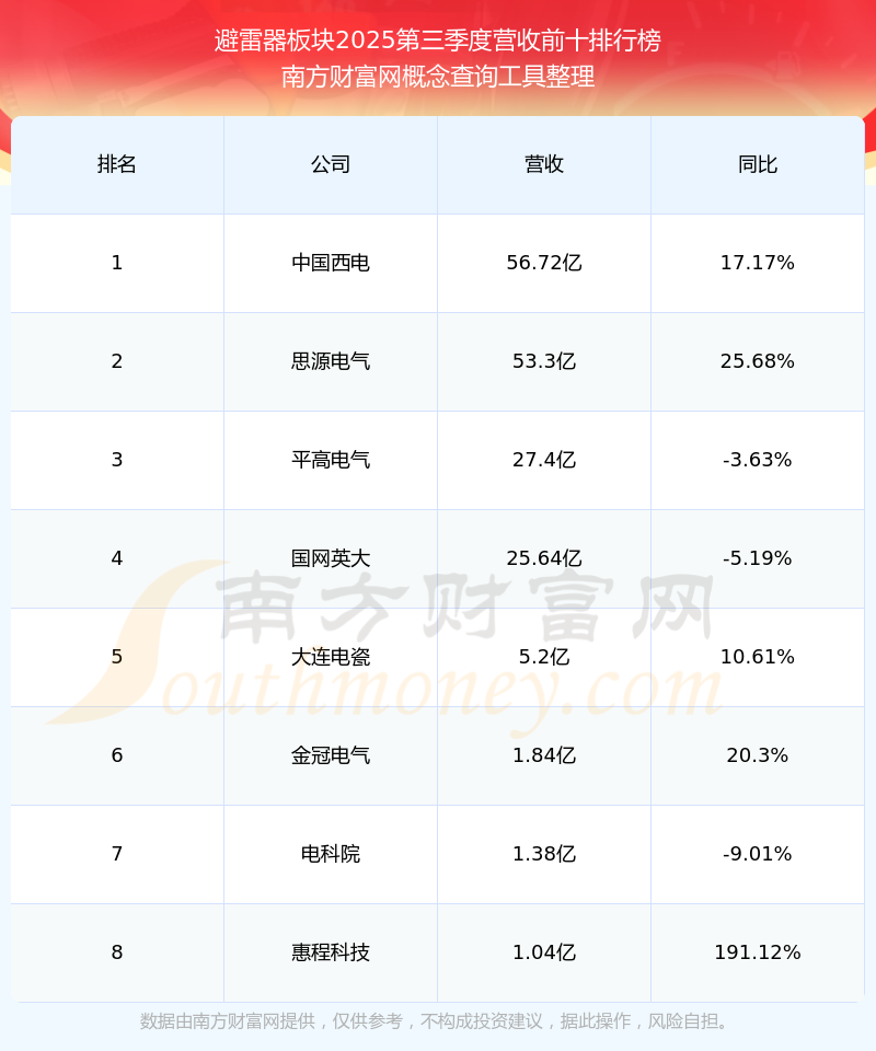 按照南方財富網(wǎng)概念查詢工具統(tǒng)計,該股所屬板塊為避雷器板塊,該板塊共有8只股票,金冠電氣2025第三季度營收在該板塊中排名為第6名,該板塊2025第三季度營收排名前十的股票如下表: