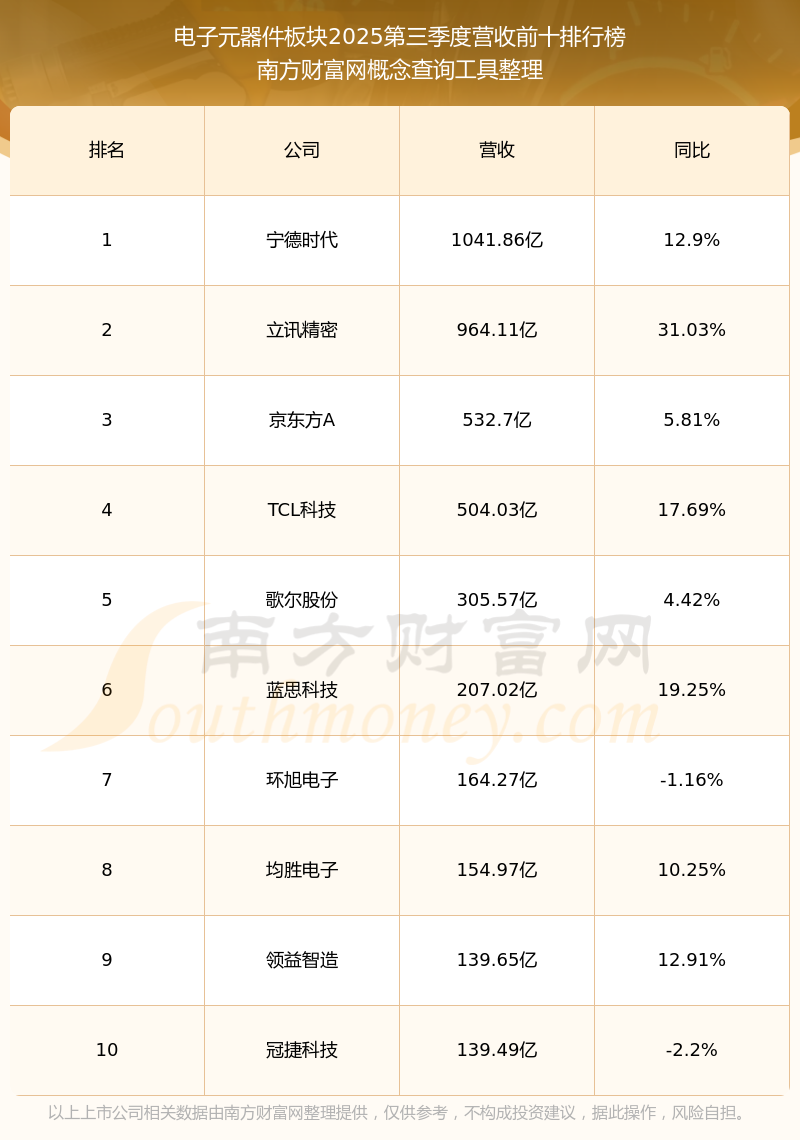 按照南方財(cái)富網(wǎng)概念查詢工具統(tǒng)計(jì),該股所屬板塊為電子元器件板塊,該板塊共有163只股票,晶方科技2025第三季度營收在該板塊中排名為第163名,該板塊2025第三季度營收排名前十的股票如下表: