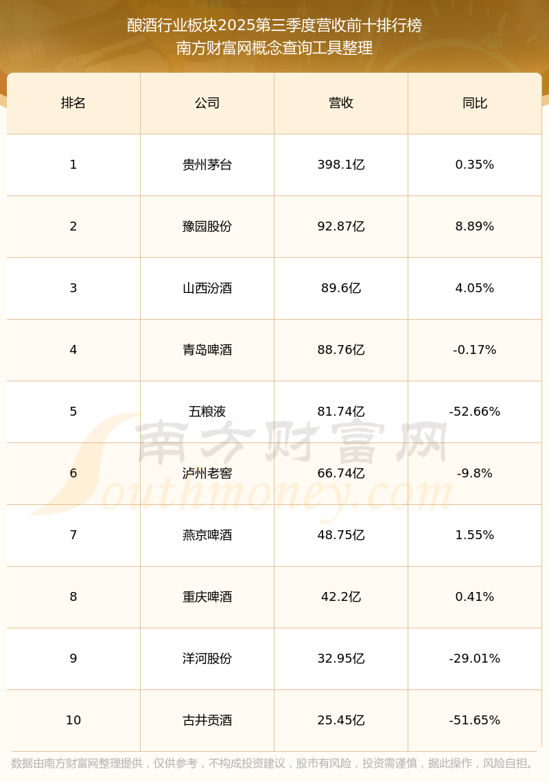 按照南方財富網(wǎng)概念查詢工具統(tǒng)計,該股所屬板塊為釀酒行業(yè)板塊,該板塊共有42只股票,通葡股份2025第三季度營收在該板塊中排名為第37名,該板塊2025第三季度營收排名前十的股票如下表: