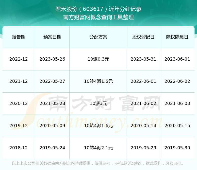 君禾股份最新一次公布的分紅方案:10派0.3元。