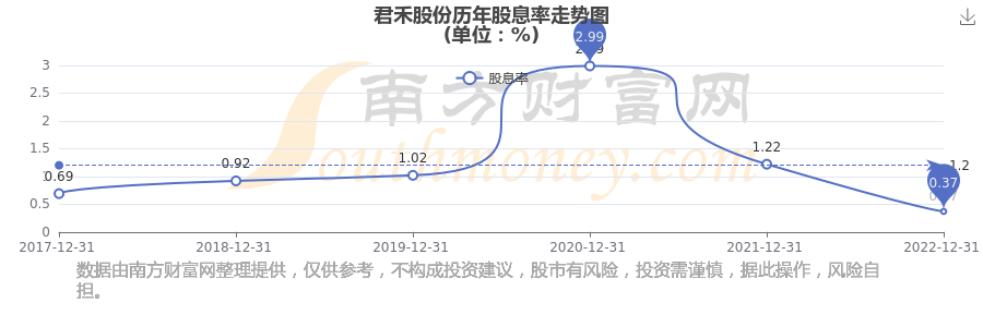 近年君禾股份年度股息率走勢(shì)如下圖: