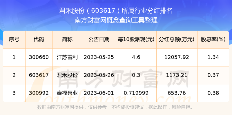 按照南方財(cái)富網(wǎng)趨勢(shì)選股系統(tǒng)統(tǒng)計(jì),君禾股份所屬行業(yè)為泵行業(yè),泵行業(yè)分紅排名情況如下表: