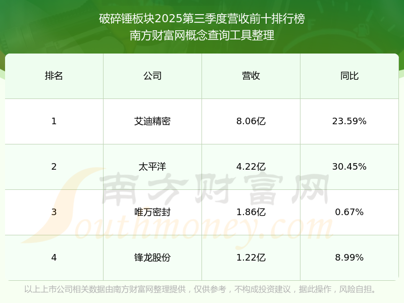 按照南方財富網(wǎng)概念查詢工具統(tǒng)計,該股所屬板塊為破碎錘板塊,該板塊共有4只股票,艾迪精密2025第三季度營收在該板塊中排名為第1名,該板塊2025第三季度營收排名前十的股票如下表: