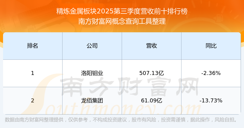 按照南方財富網(wǎng)概念查詢工具統(tǒng)計,該股所屬板塊為精煉金屬板塊,該板塊共有2只股票,洛陽鉬業(yè)2025第三季度營收在該板塊中排名為第1名,該板塊2025第三季度營收排名前十的股票如下表: