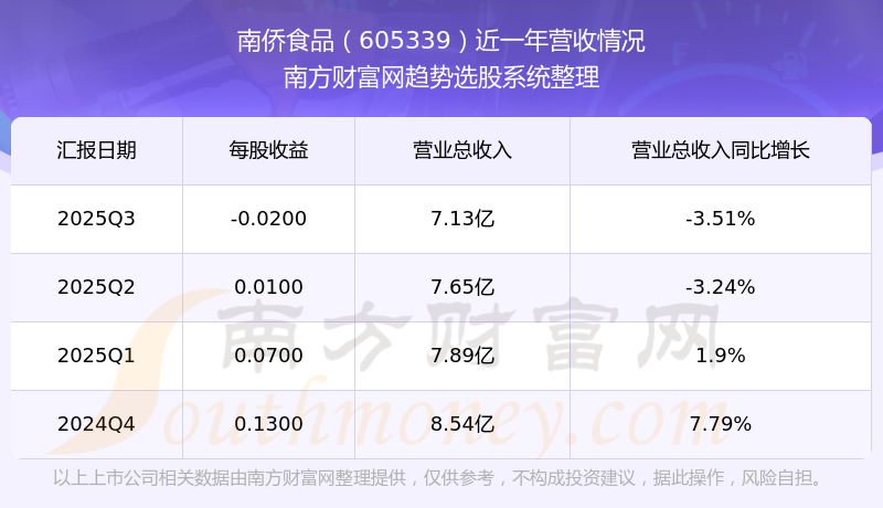 南僑食品2025年第三季度公司實(shí)現(xiàn)營(yíng)業(yè)收入7.13億元,同比-3.51%;歸母凈利潤(rùn)-713.95萬(wàn)元,同比-132.68%。