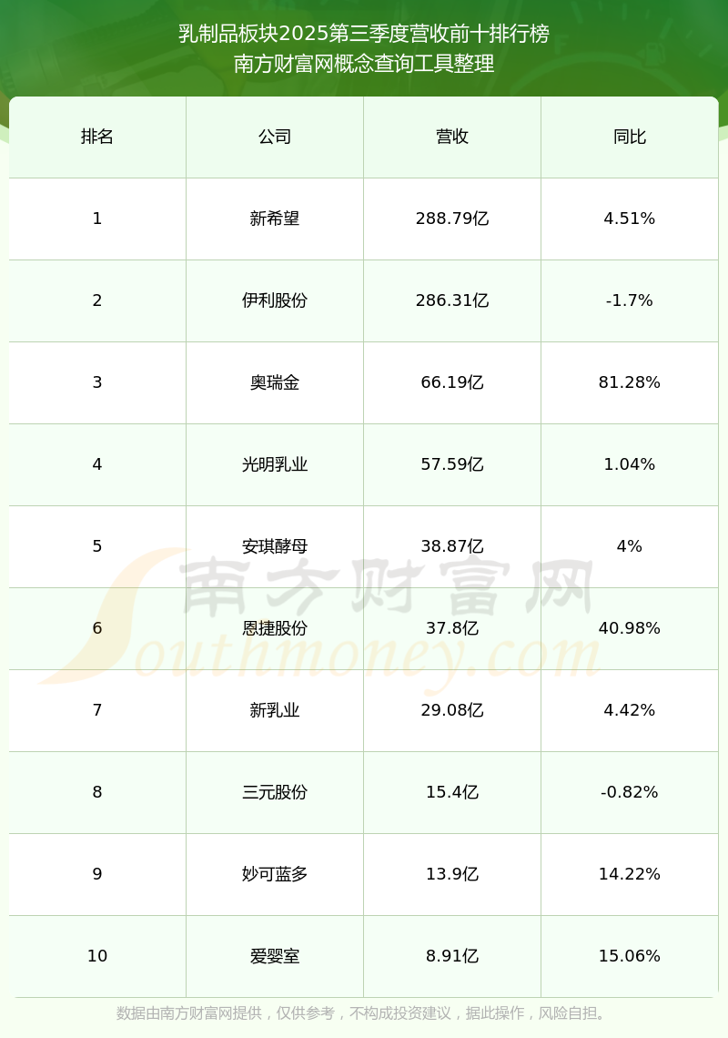 按照南方財(cái)富網(wǎng)概念查詢(xún)工具統(tǒng)計(jì),該股所屬板塊為乳制品板塊,該板塊共有31只股票,南僑食品2025第三季度營(yíng)收在該板塊中排名為第31名,該板塊2025第三季度營(yíng)收排名前十的股票如下表: