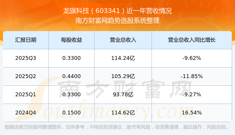 龍旗科技(603341)披露2025年第三季度報告,報告期實現(xiàn)營收114.24億元,同比-9.62%;歸母凈利潤1.52億元,同比64.46%;扣非凈利潤9238.17萬元,同比56.18%;基本每股收益0.33元。