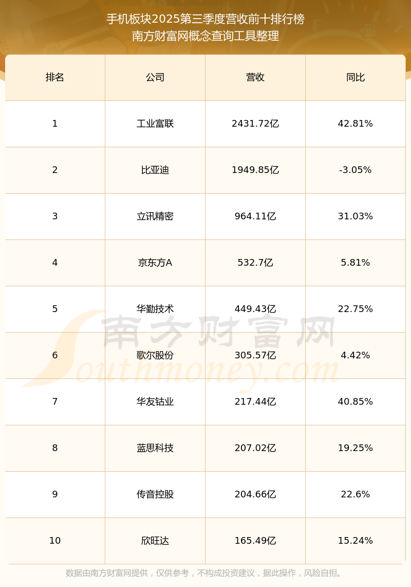 按照南方財富網(wǎng)概念查詢工具統(tǒng)計,該股所屬板塊為手機板塊,該板塊共有137只股票,龍旗科技2025第三季度營收在該板塊中排名為第137名,該板塊2025第三季度營收排名前十的股票如下表: