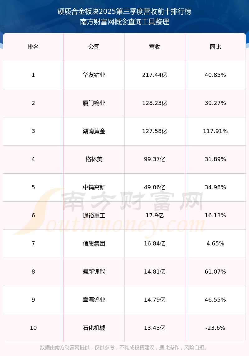 按照南方財富網(wǎng)概念查詢工具統(tǒng)計,該股所屬板塊為硬質(zhì)合金板塊,該板塊共有22只股票,新銳股份2025第三季度營收在該板塊中排名為第14名,該板塊2025第三季度營收排名前十的股票如下表: