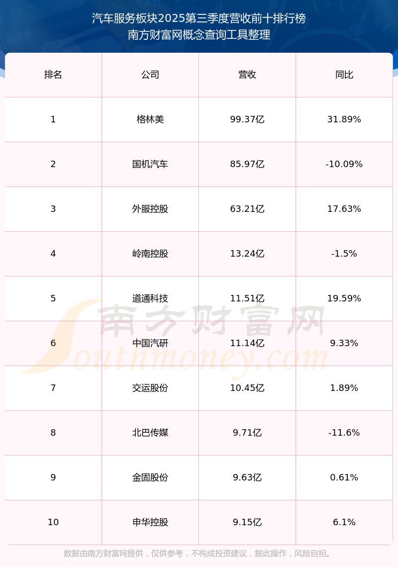 按照南方財(cái)富網(wǎng)概念查詢工具統(tǒng)計(jì),該股所屬板塊為汽車服務(wù)板塊,該板塊共有24只股票,申華控股2025第三季度營收在該板塊中排名為第10名,該板塊2025第三季度營收排名前十的股票如下表: