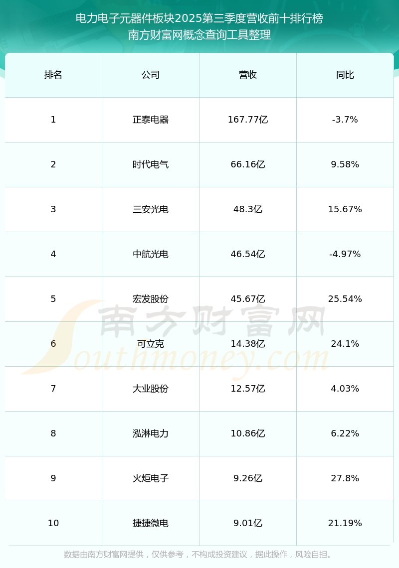 按照南方財富網(wǎng)概念查詢工具統(tǒng)計,該股所屬板塊為電力電子元器件板塊,該板塊共有32只股票,新風光2025第三季度營收在該板塊中排名為第32名,該板塊2025第三季度營收排名前十的股票如下表: