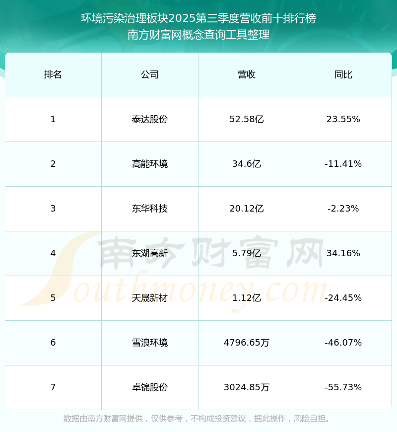 按照南方財(cái)富網(wǎng)概念查詢工具統(tǒng)計(jì),該股所屬板塊為環(huán)境污染治理板塊,該板塊共有7只股票,通源環(huán)境2025第三季度營收在該板塊中排名為第7名,該板塊2025第三季度營收排名前十的股票如下表: