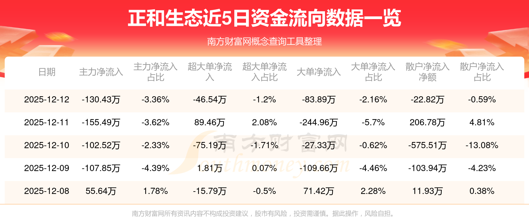 12月12日消息,正和生態(tài)主力凈流出130.43萬元,超大單凈流出46.54萬元,散戶凈流出22.82萬元。