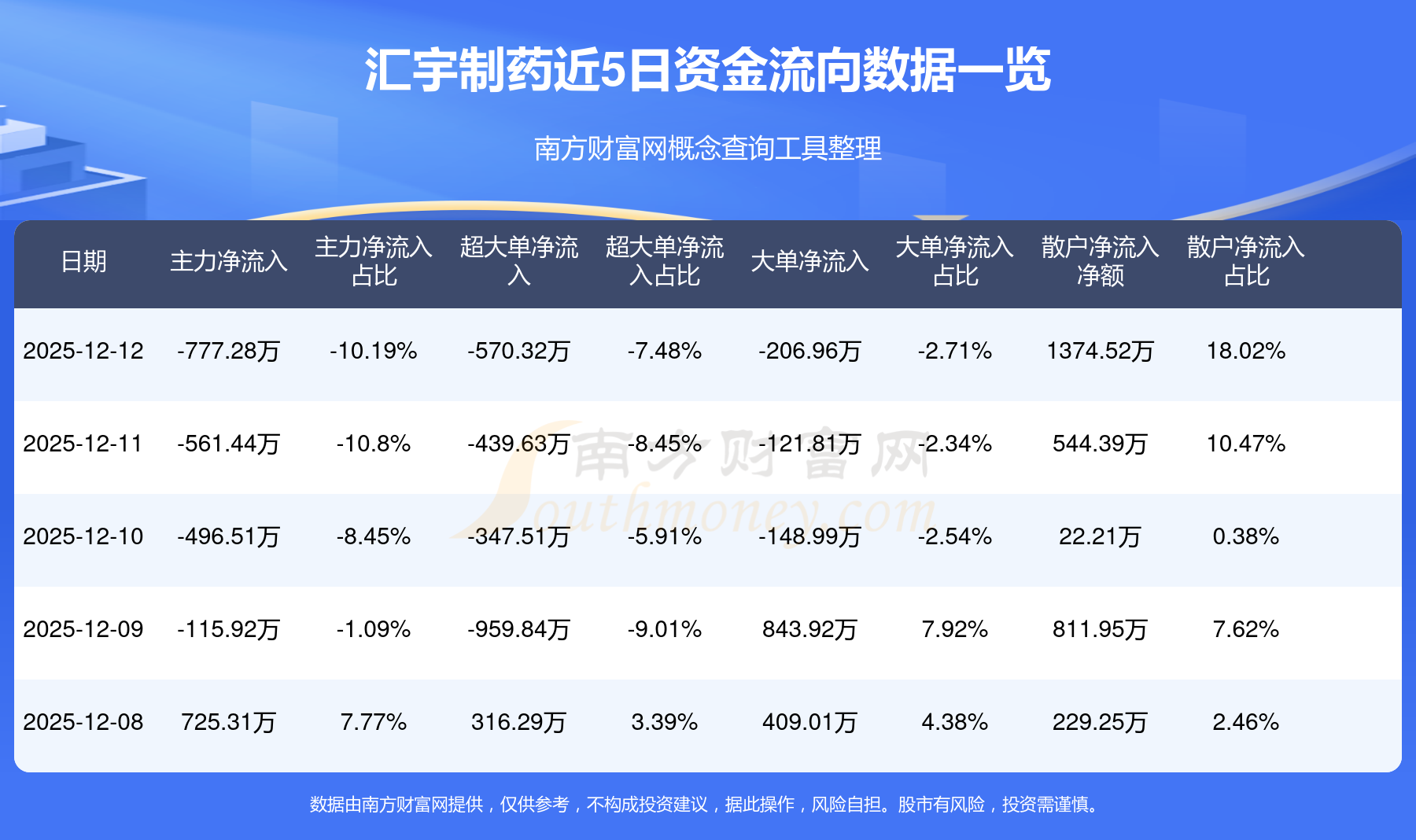 12月12日消息,匯宇制藥12月12日主力資金凈流出777.28萬元,超大單資金凈流出570.32萬元,大單資金凈流出206.96萬元,散戶資金凈流入1374.52萬元。