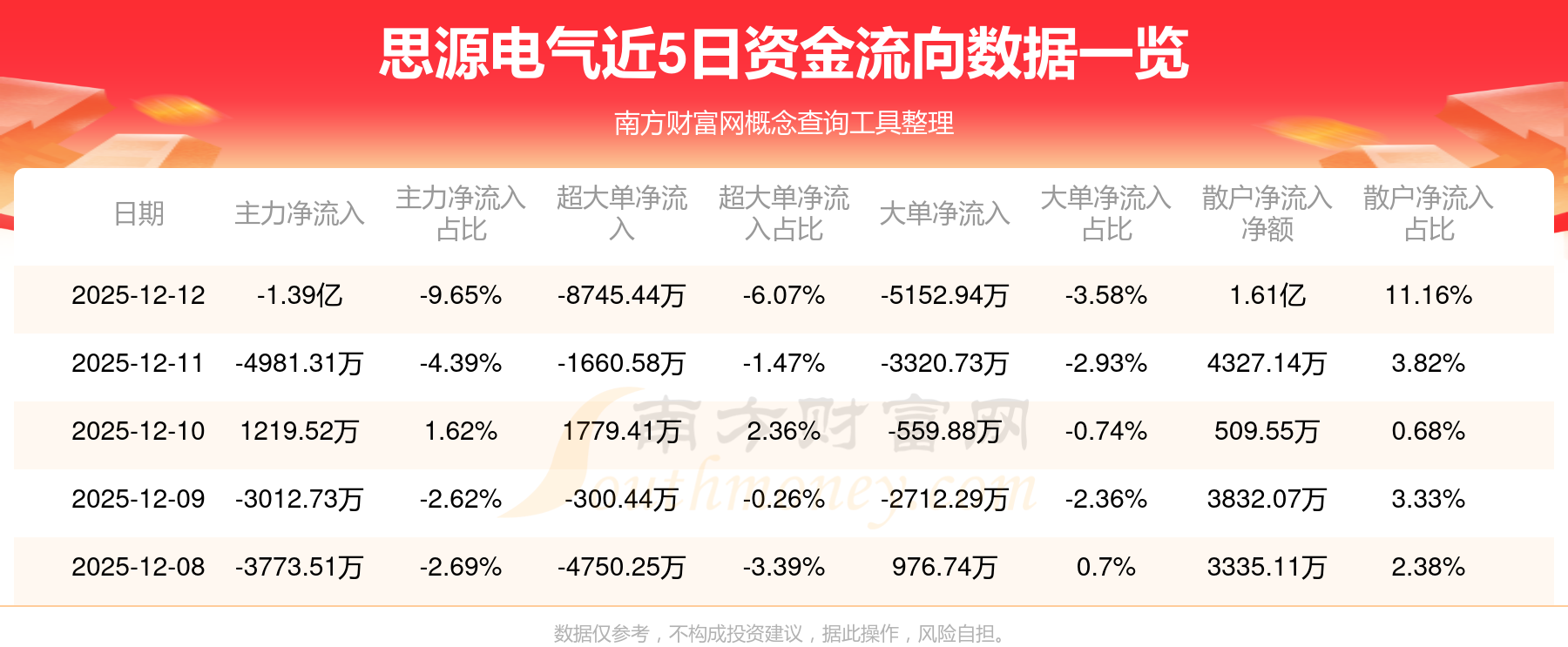 12月12日消息,思源電氣12月12日主力資金凈流出1.39億元,超大單資金凈流出8745.44萬元,大單資金凈流出5152.94萬元,散戶資金凈流入1.61億元。