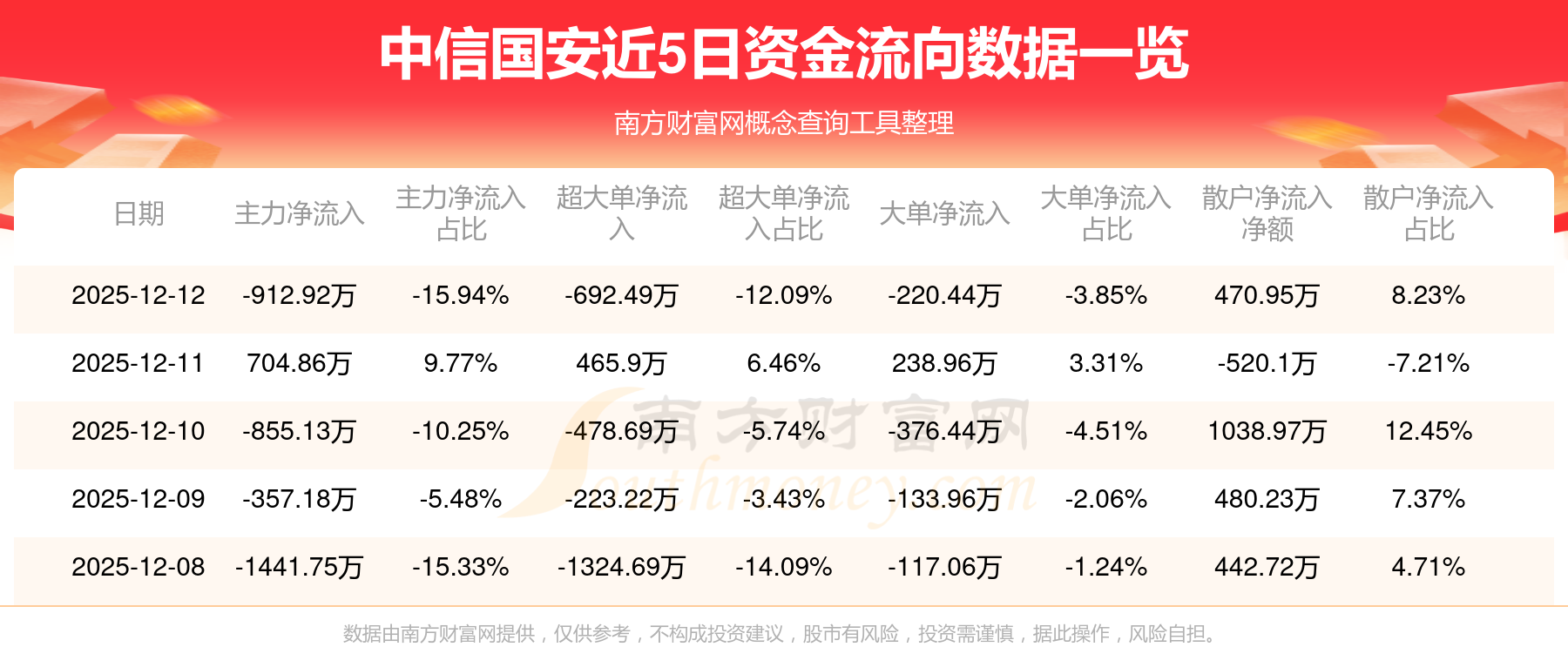 12月12日消息,國安股份資金凈流出912.92萬元,超大單資金凈流出692.49萬元,換手率0.36%,成交金額3715.56萬元。