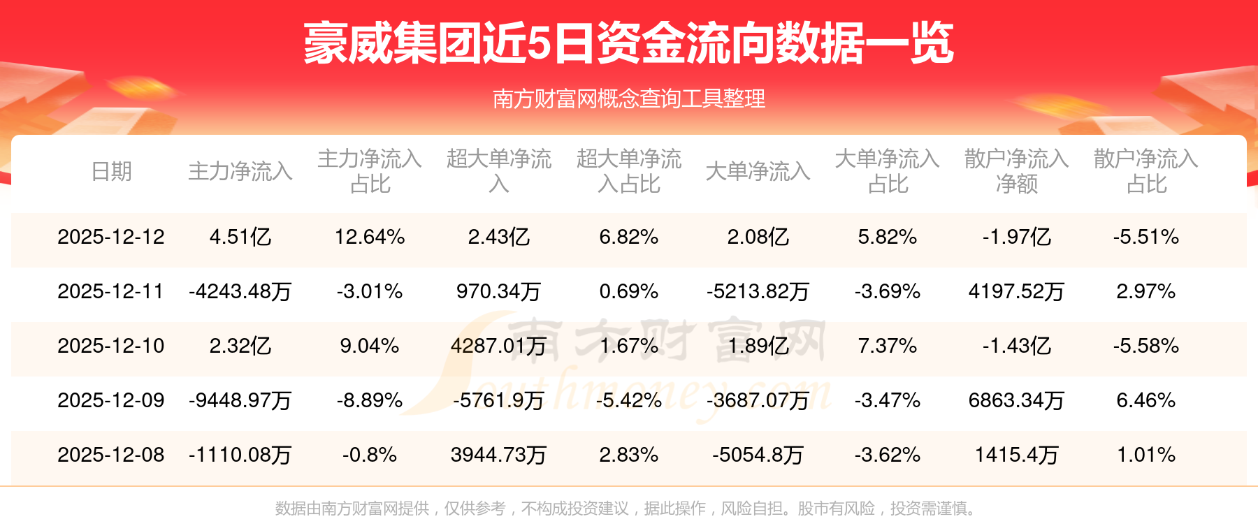 12月12日該股主力凈流入4.51億元,超大單凈流入2.43億元,大單凈流入2.08億元,中單凈流出2.54億元,散戶凈流出1.97億元。