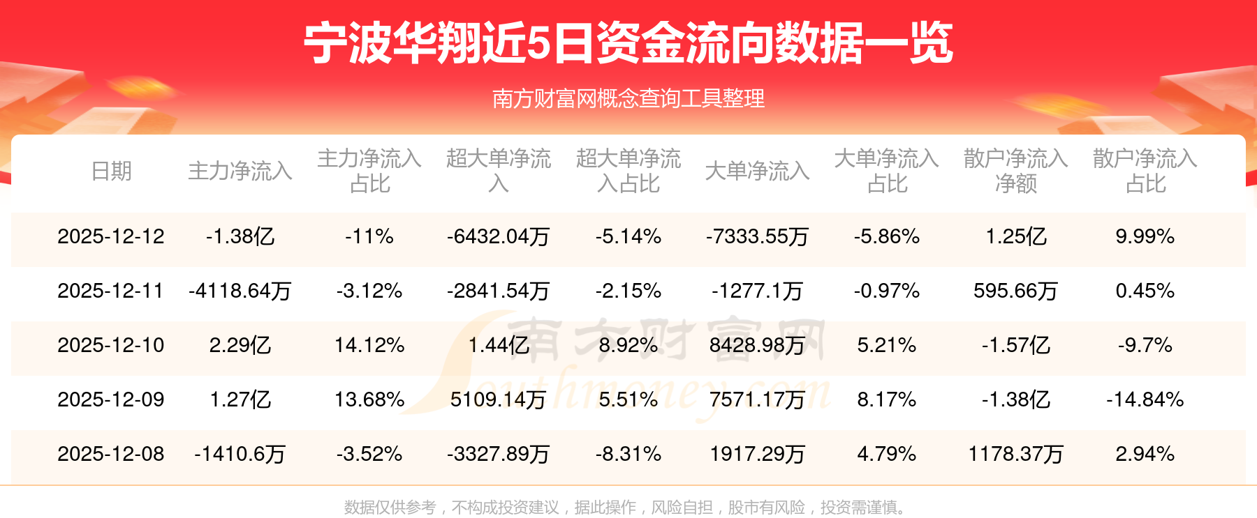 12月12日消息,寧波華翔主力凈流出1.38億元,超大單凈流出6432.04萬元,散戶凈流入1.25億元。
