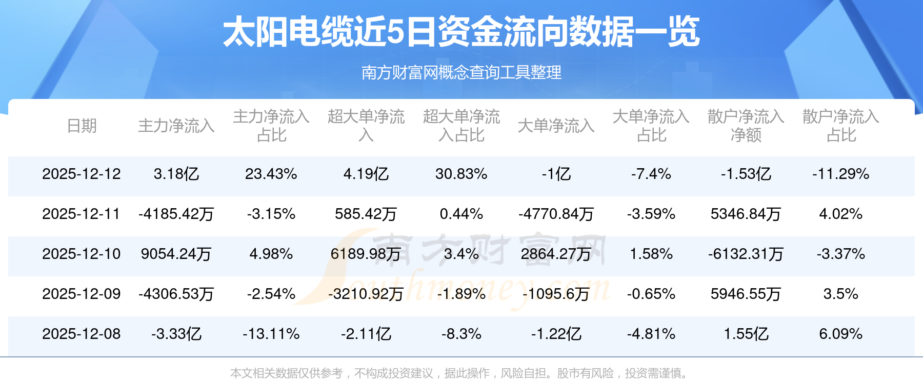 12月12日消息,太陽電纜主力凈流入3.18億元,超大單凈流入4.19億元,散戶凈流出1.53億元。