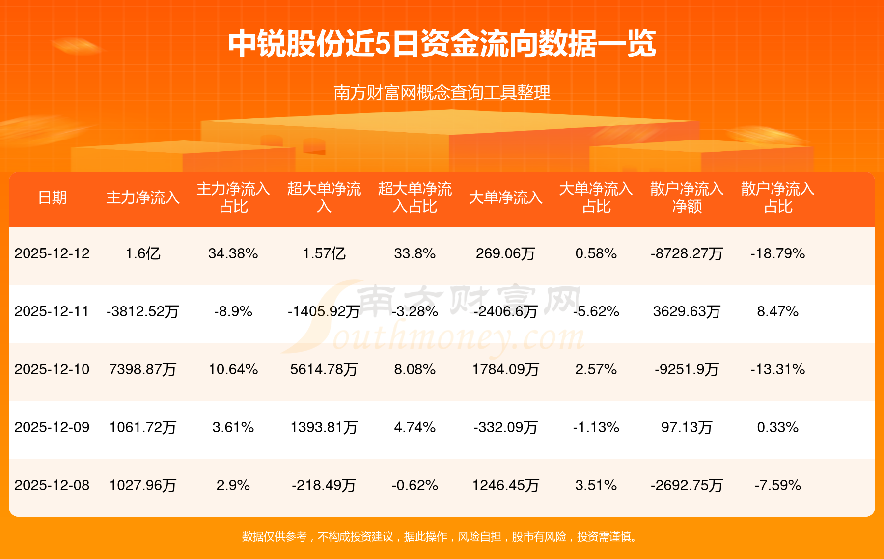 12月12日消息,中銳股份資金凈流入1.6億元,超大單資金凈流入1.57億元,換手率11.77%,成交金額4.59億元。